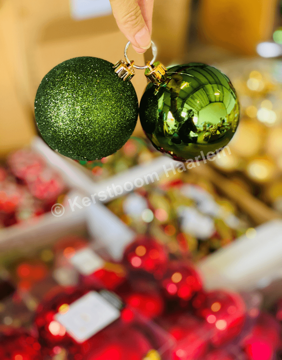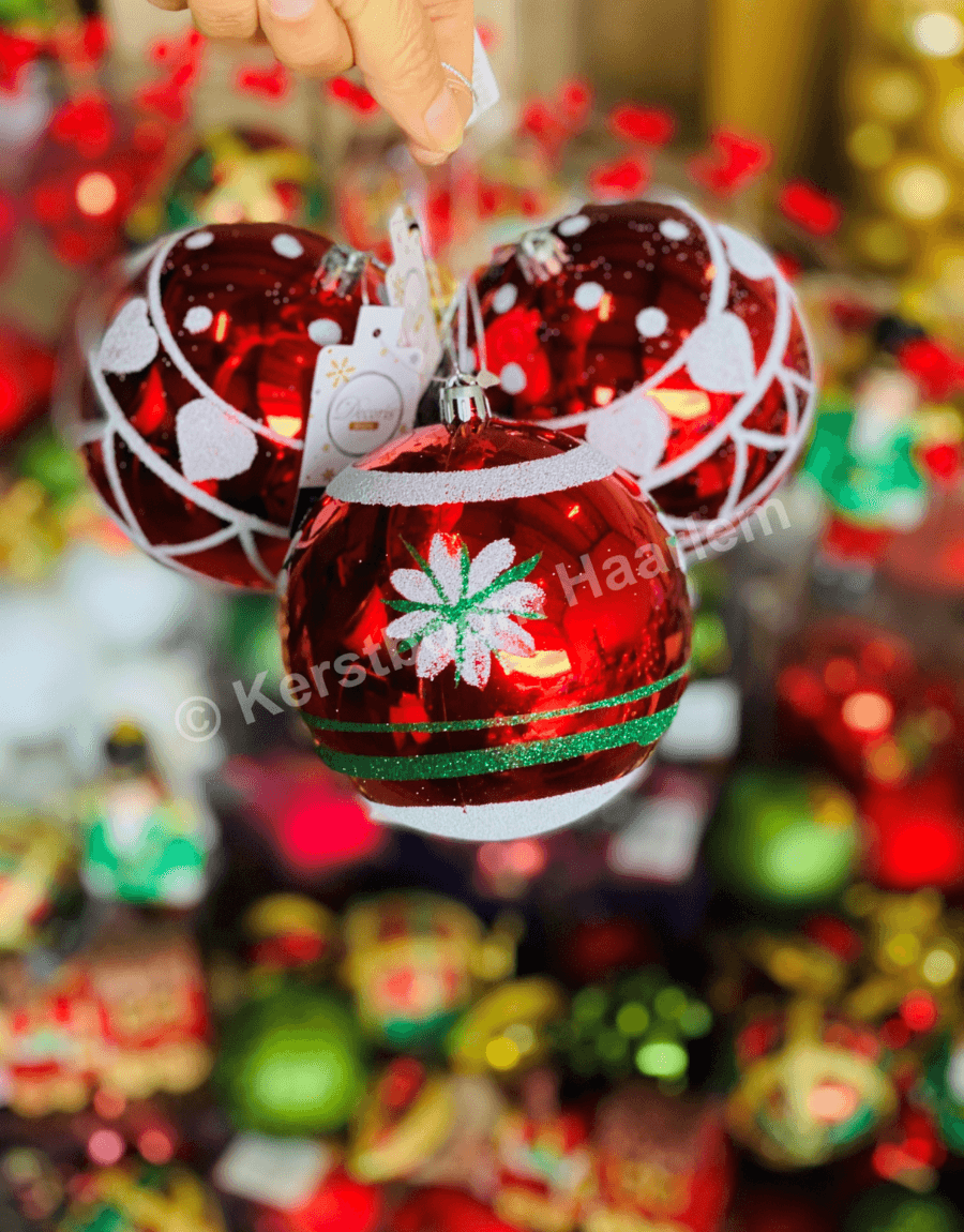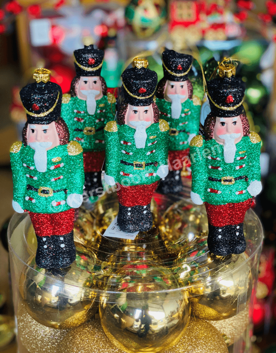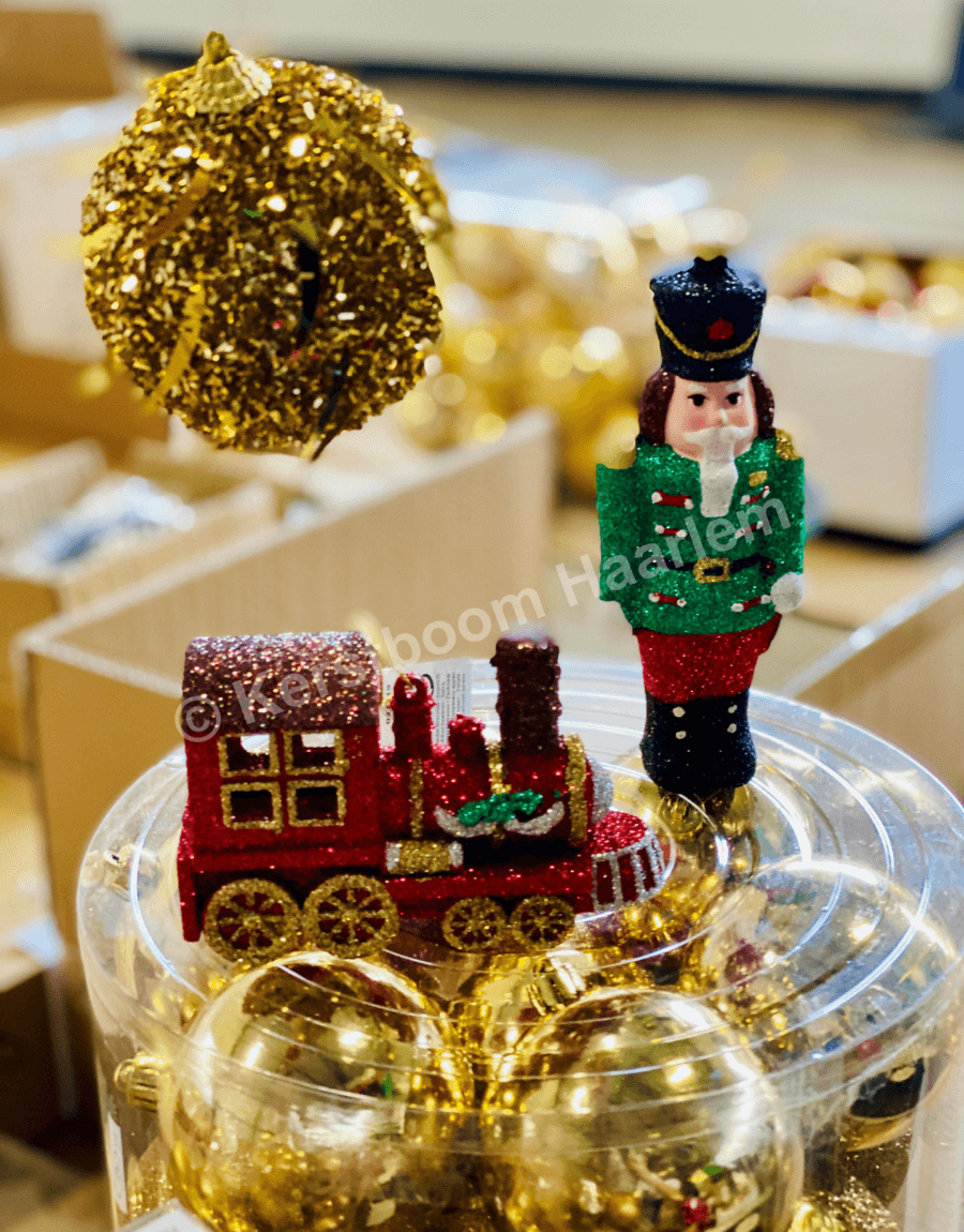 Basic colours: green, red, champagne and gold. Special items: nutcrackers, trains and pendants.